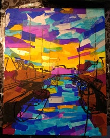 Dit werk is gemaakt door eerst een collage te maken met vliegerpapier als ondergrond en daarop is geschilderd. Tijdens het schilderen beïnvloed de ondergrond het schilderen, waardoor er wellicht andere keuzes worden gemaakt.